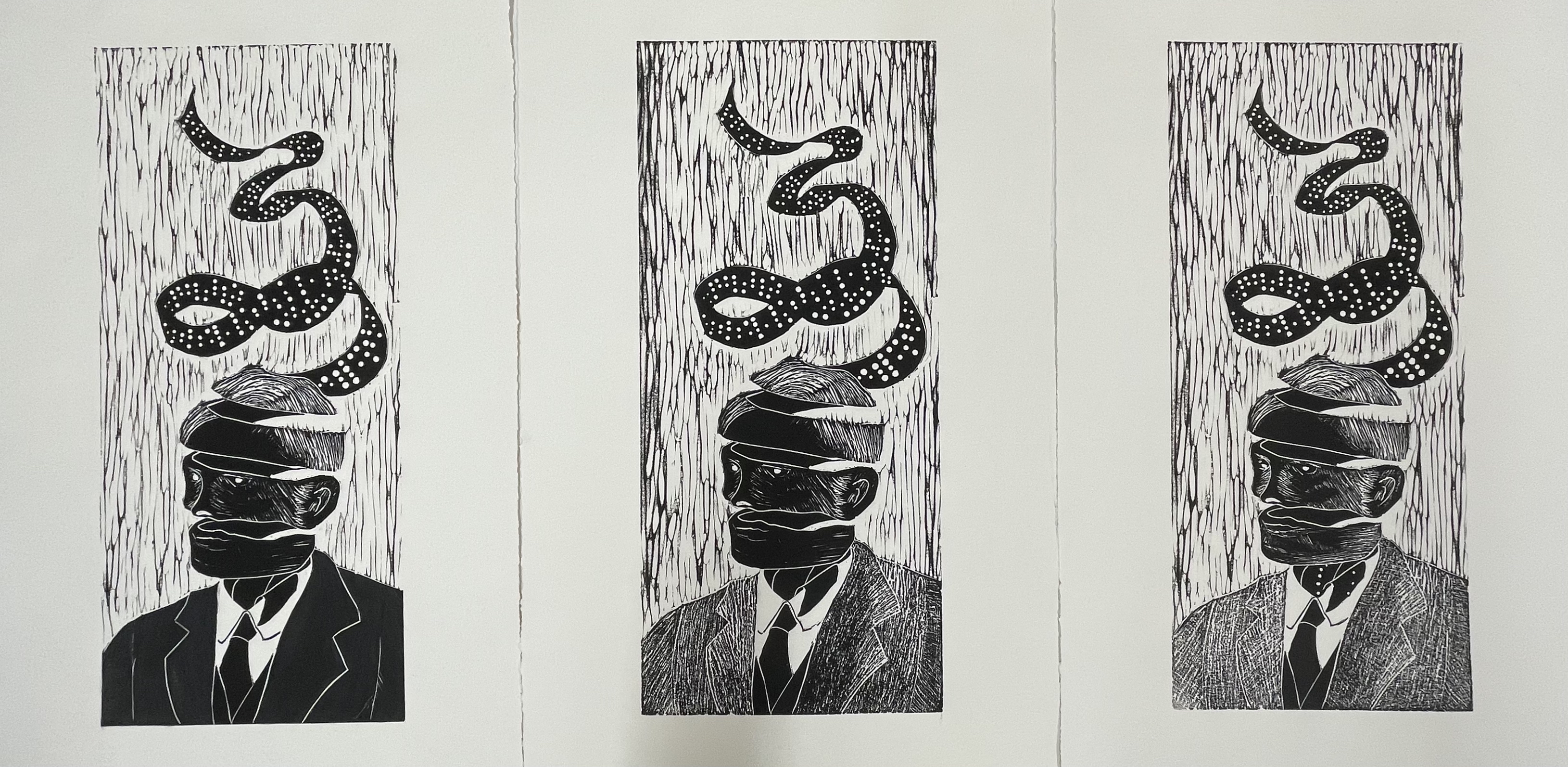 Triptych lino cut on Arches White, 8" x 20" each, 2022